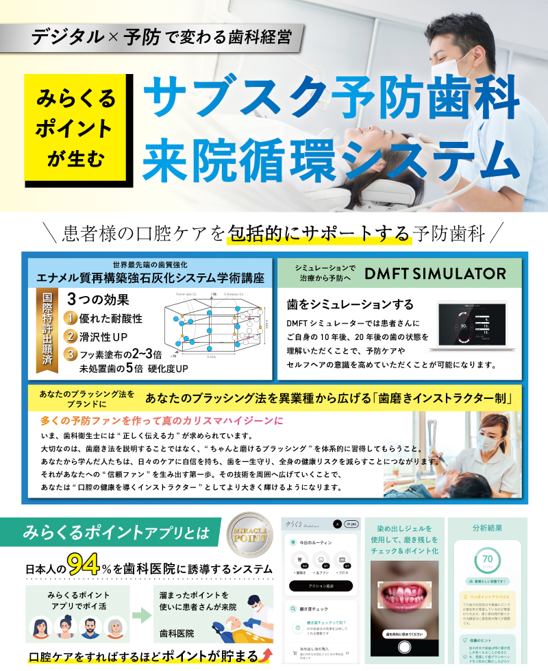 | セミナープログラム | ・世界最先端の歯質強化【エナメル質再構築強石化システム学術講座】 ・シュミレーションで治療から予防へ【 DMFT SIMULATOR】 ・あなたオリジナルブラッシング法を異業種から広げる「歯磨きインストラクター制」 |